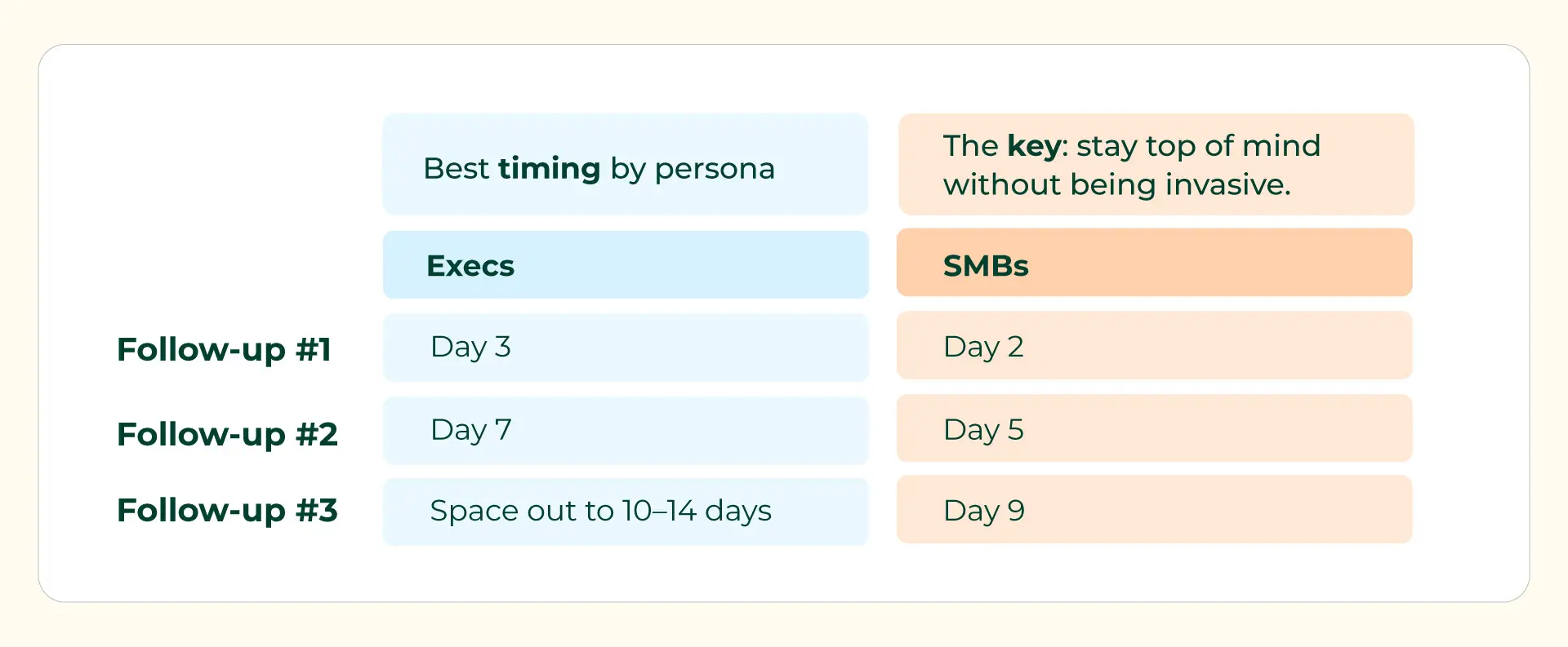 For SMB owners, who tend to check their own inbox and make decisions faster, a 2-day window is more effective. They’re closer to the pain and move quickly when the value proposition is clear.