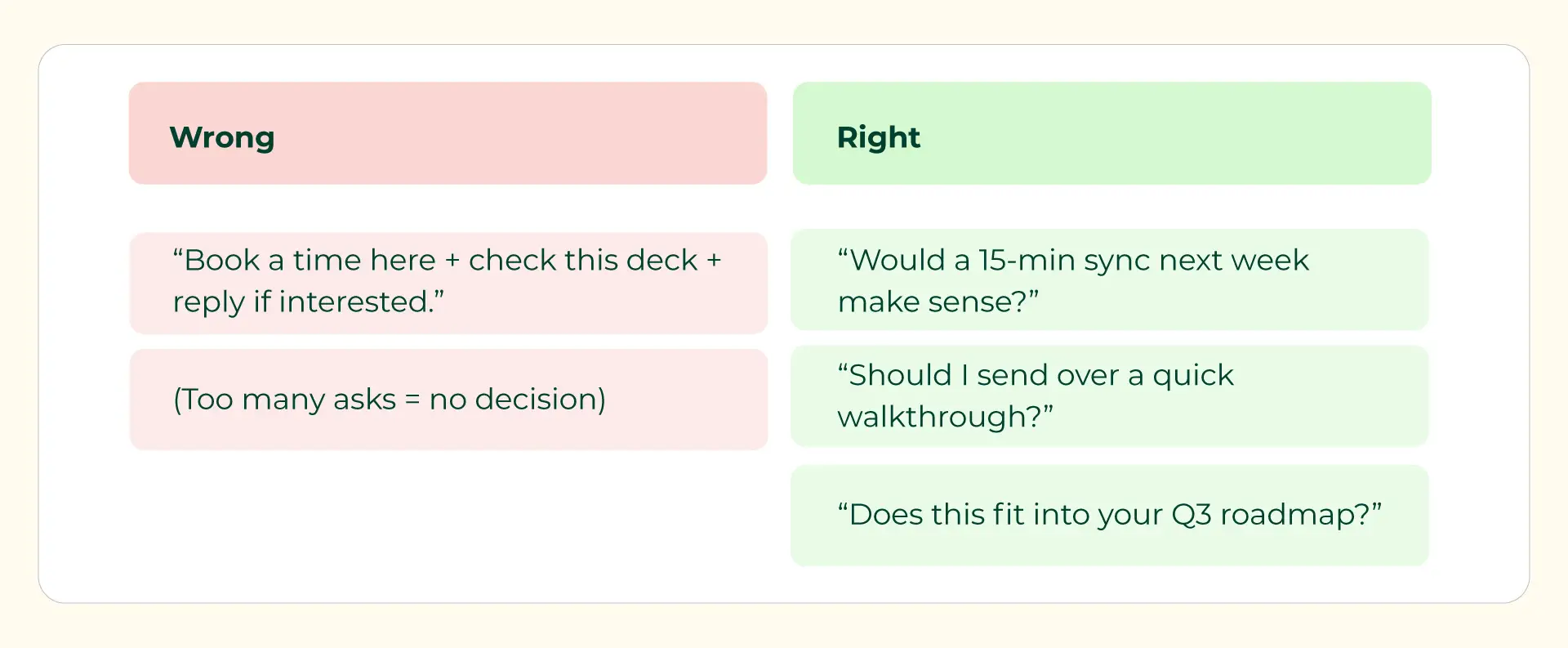 - Avoid extras: no decks, no Calendly, no overload.