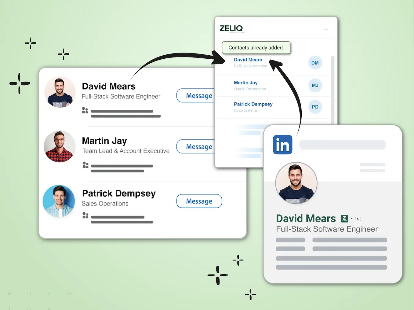 Add prospects from Linkedin and Sales Navigator to ZELIQ in 1-Click by clicking a green “add to zeliq button”.