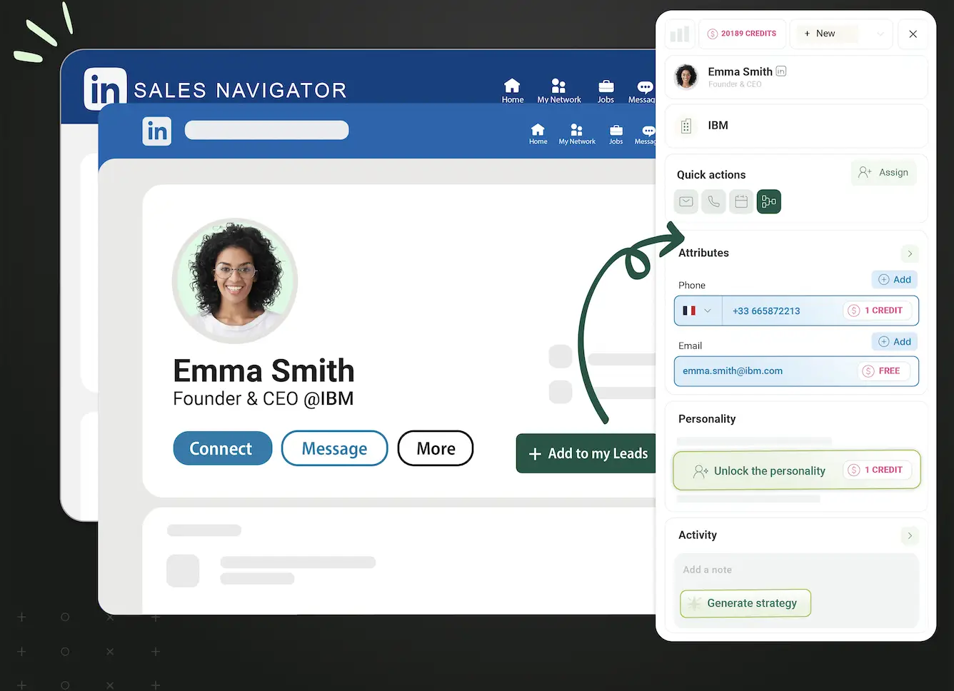 Find your contact’s email and phone number directly from our Linkedin pop up.