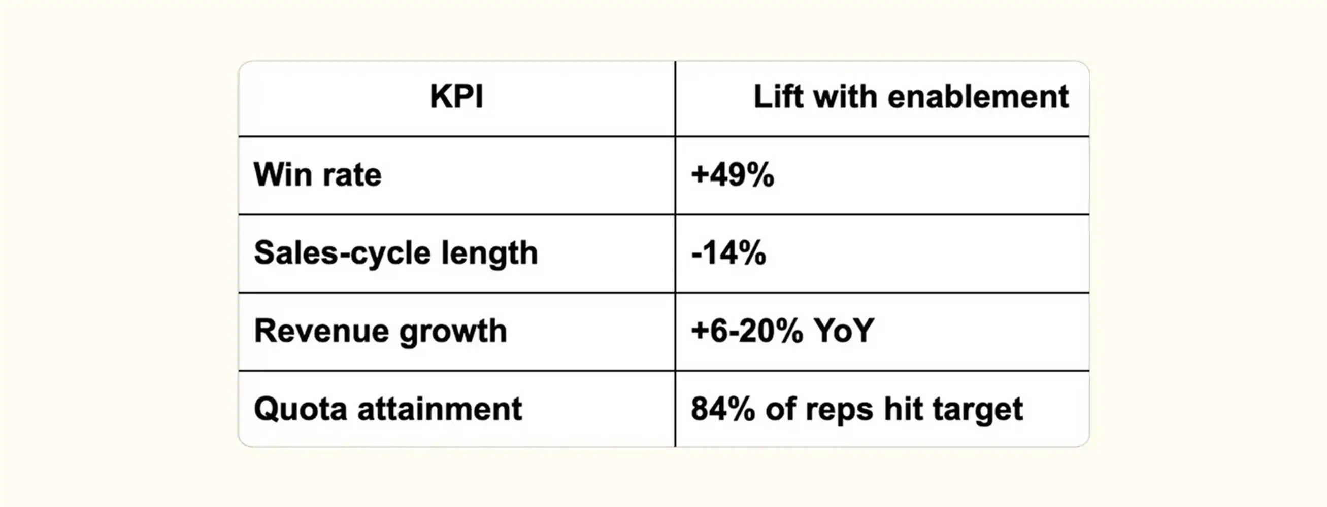 - Orgs with mature enablement post a 49% higher win rate on forecasted deals.
