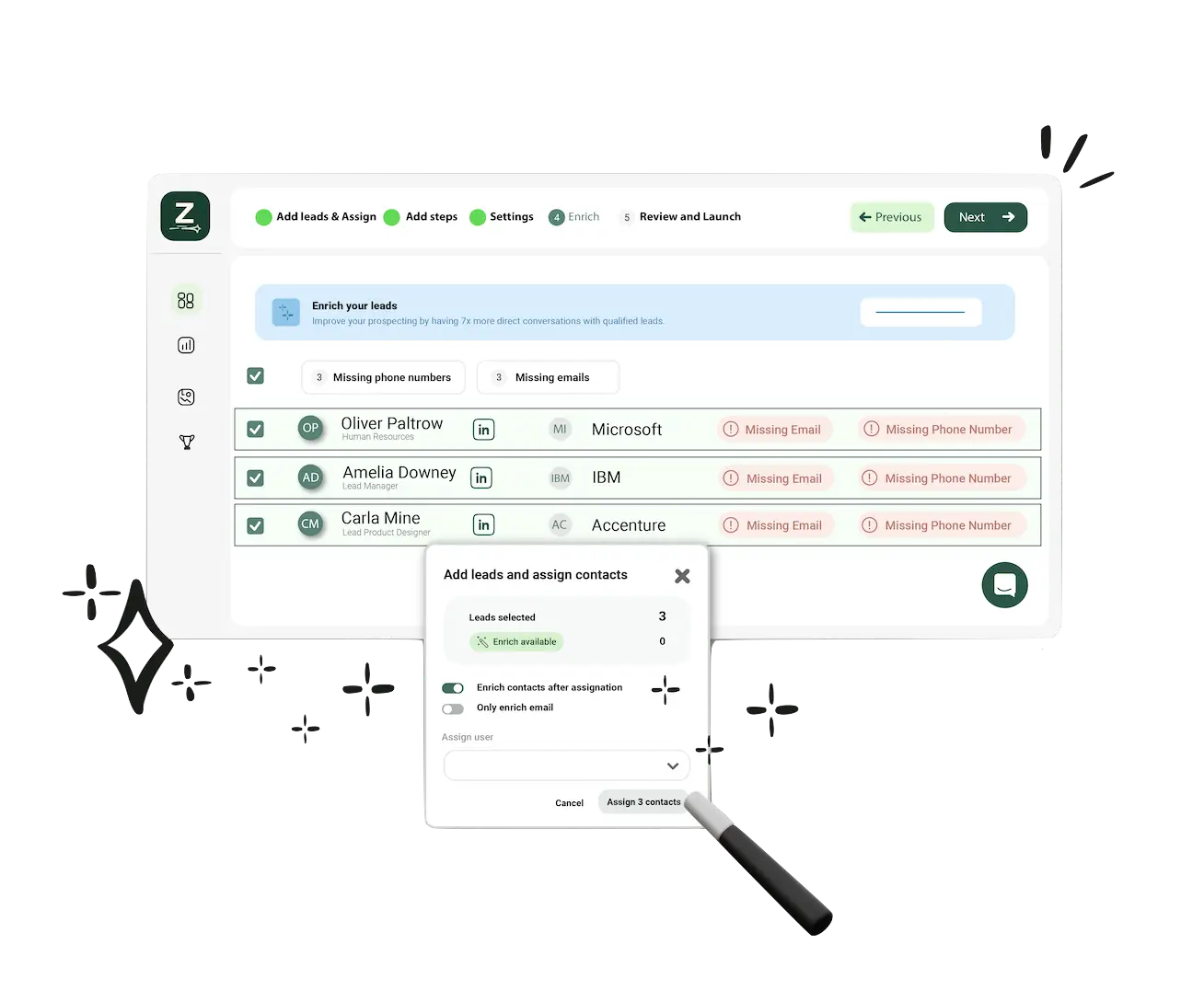 For prospects without emails or phone numbers, ZELIQ can enrich them for you automatically on this step. With our waterfall workflow & debouncing technology we will find the most accurate and up- to-date email addresses ensuring high deliverability rate.