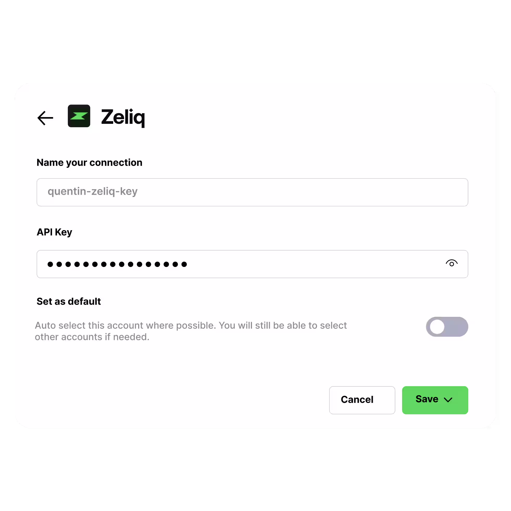 You can access your API key in Zeliq app, in the section "Integrations". Contact support@zeliq.com or reach out via the chatbot if you need help to find it!