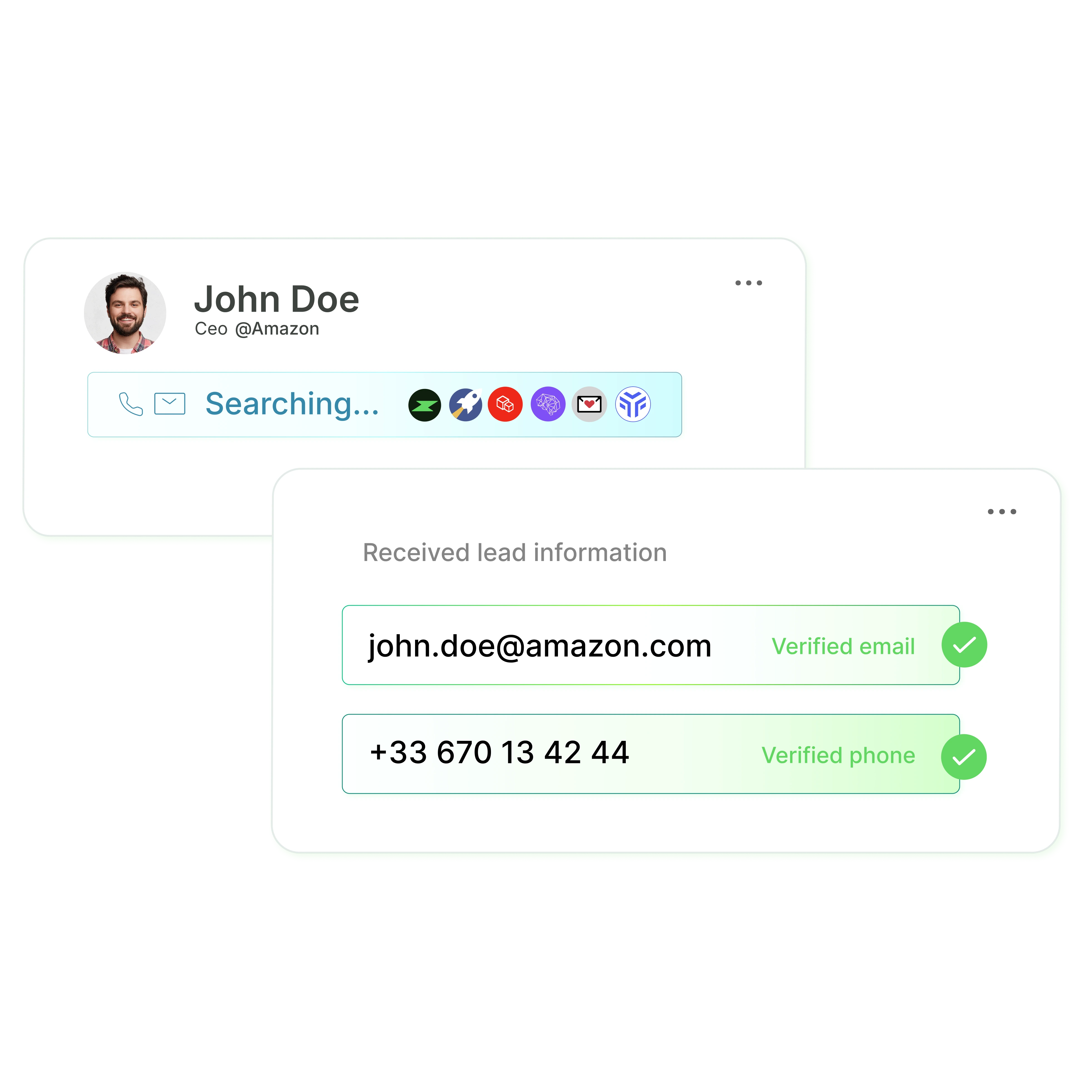 Obtenez emails et numéros de téléphones vérifiés grâce à notre enrichissement en cascade via 40+ fournisseurs.