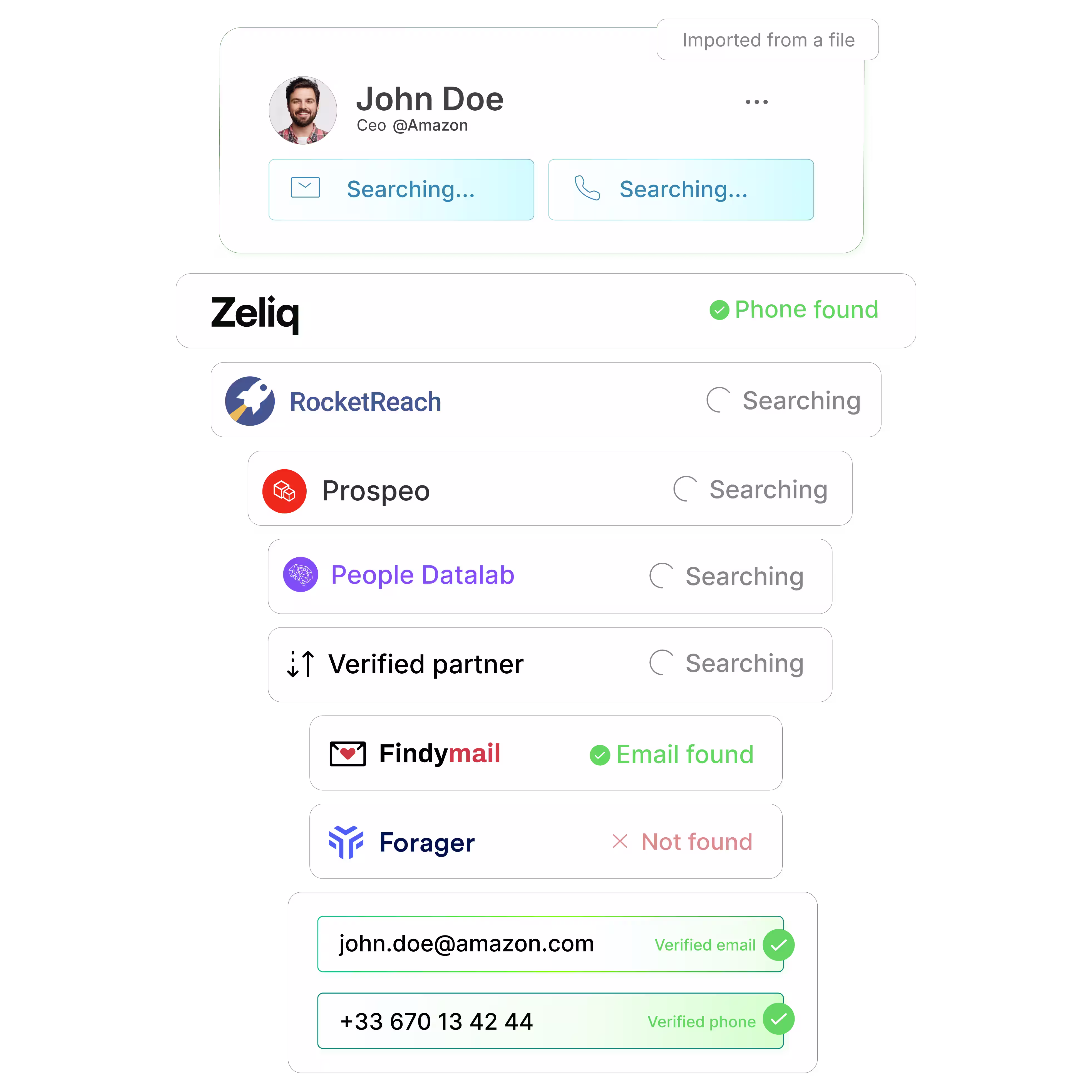 Chez Zeliq, le terme de « cascade d'enrichissement » désigne un processus par lequel les données de contact ou d'entreprise sont automatiquement enrichies via plusieurs fournisseurs spécialisés, interrogés les uns après les autres afin de maximiser les chances de trouver des informations pertinentes (adresses e-mail, numéros de téléphone, etc.).