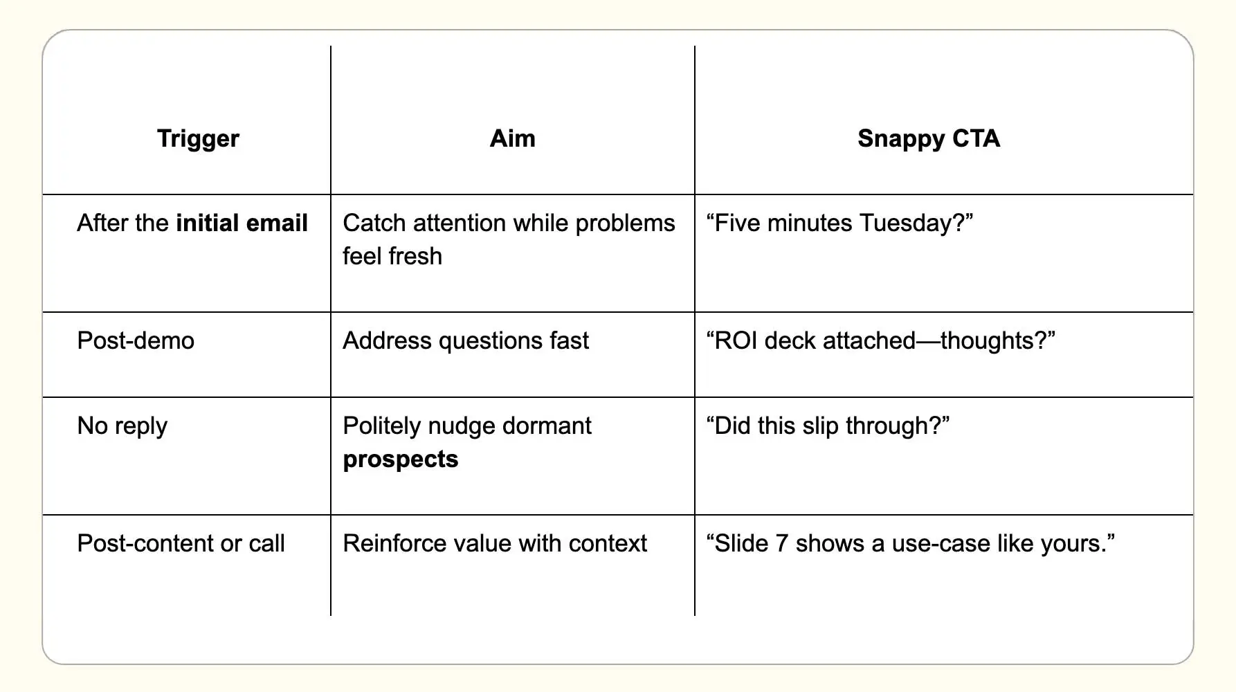 - Fix: One fresh resource + one specific ask (“Five‑minute call tomorrow?”). Crisp CTAs lift replies.
