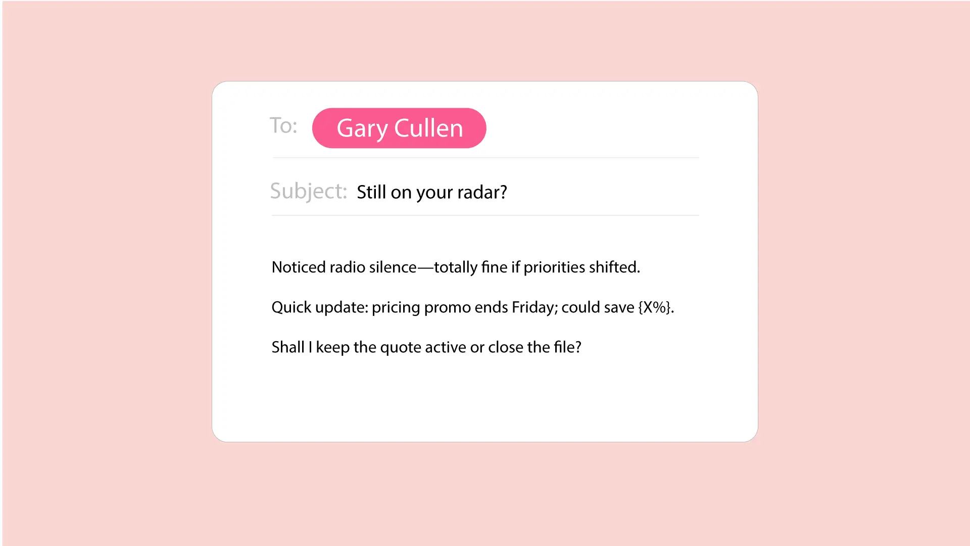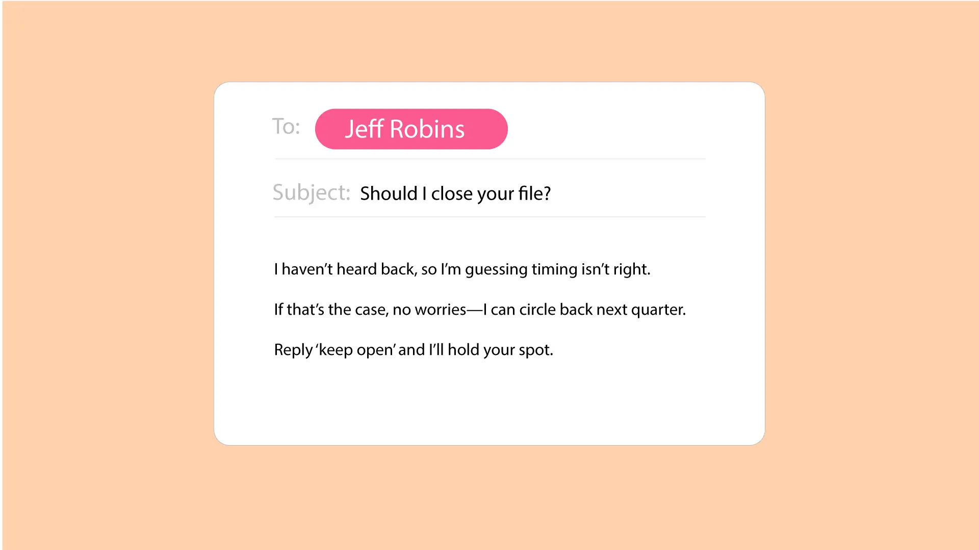Why it works: Creates FOMO; prospects often resurface to stay in the loop.