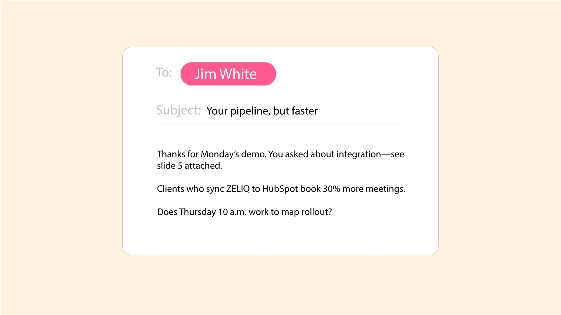 Body: Thanks for Monday’s demo. You asked about integration—see slide 5 attached.