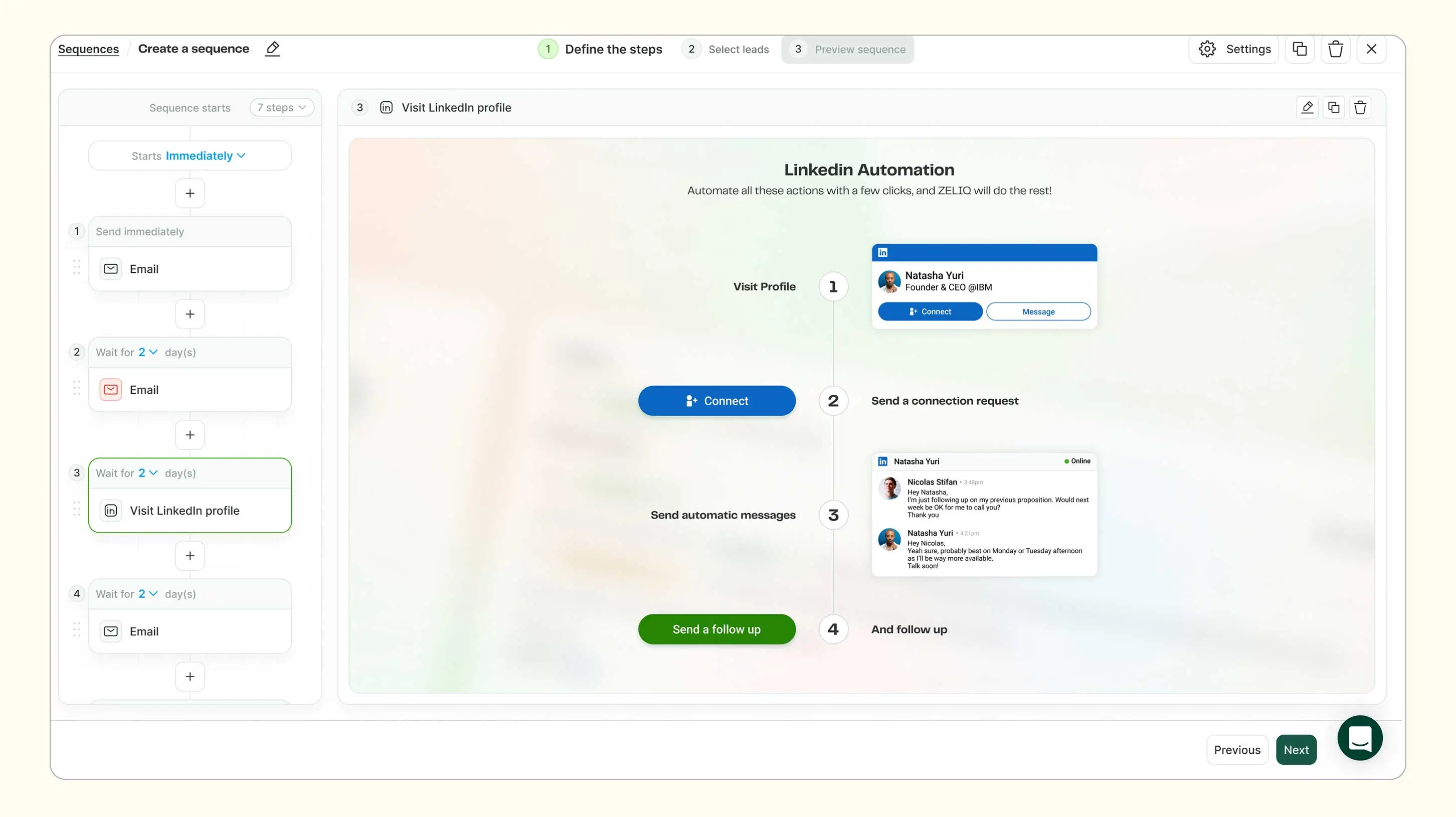 For example, if a prospect visits your profile or engages with one of your posts, ZELIQ can automatically trigger a follow-up sequence.