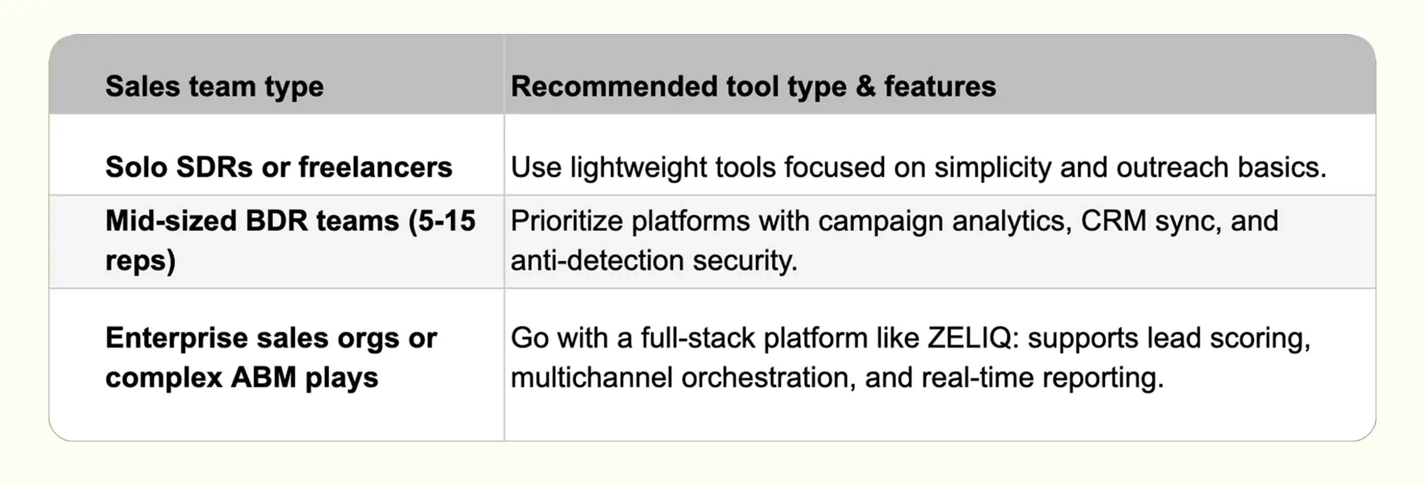 Your tool should align with your team’s size, motion, revenue goals, and help you save time at every stage of outreach.