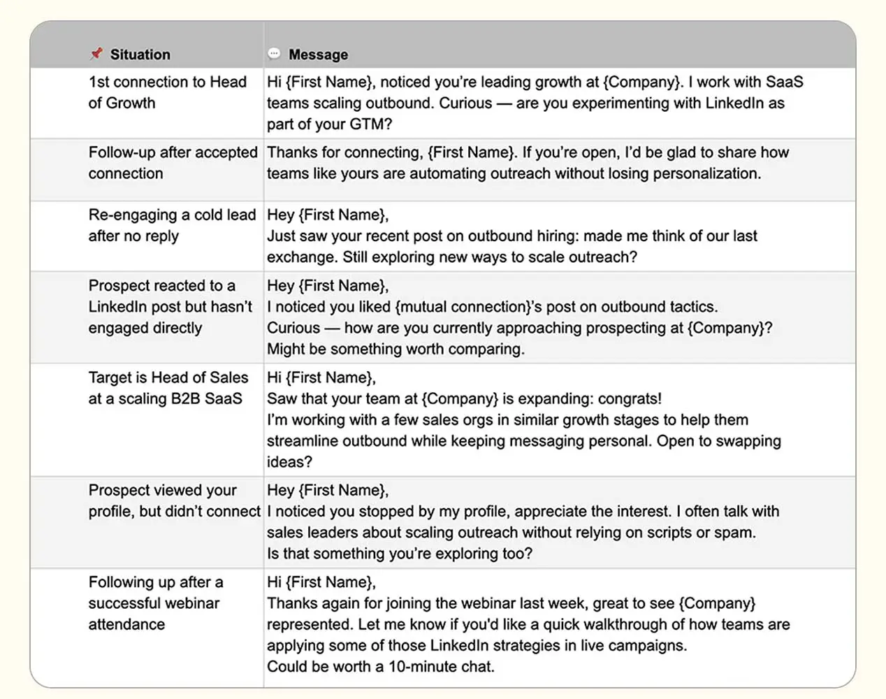 - Avoid mass-blast templates: Replace “Hi there, saw your profile” with micro-personalized lines: “Noticed your team’s been growing, curious how you’re approaching outbound?”