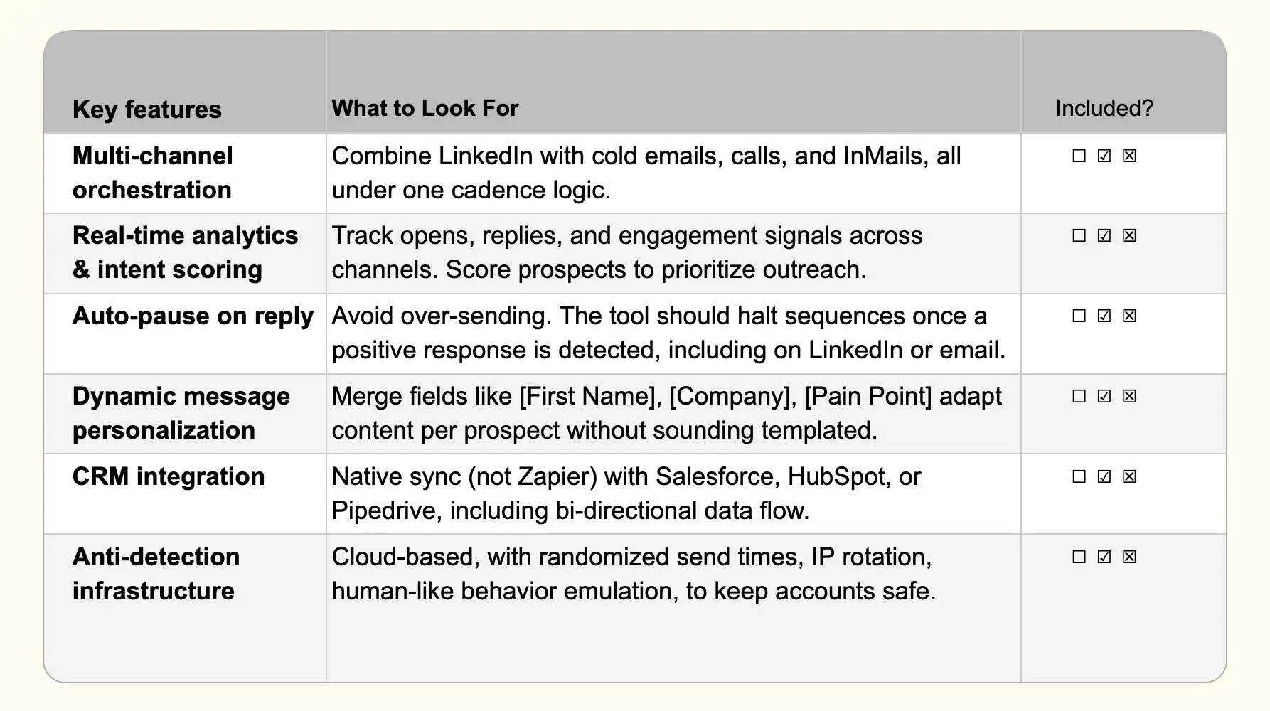 Let’s look at the key features of LinkedIn automation tools that drive compliant, scalable outreach. Use this checklist to make an informed décision before committing to a new LinkedIn automation tool.